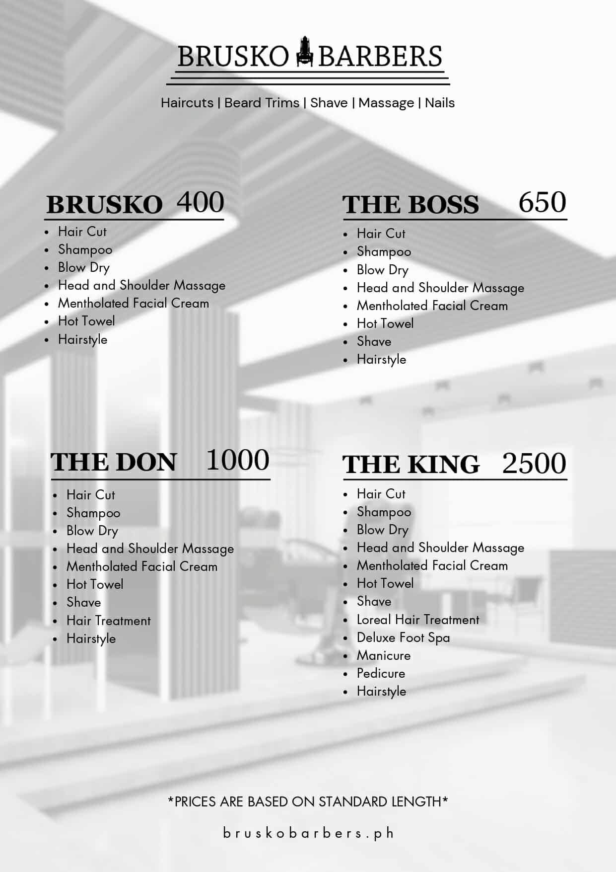 BRUSKO BARBER IS COMMITTED IN GIVING THE BEST GROOMING SERVICES TO MEN. AIM TO PROVIDE WOWING SERVICE TO EVERY GUEST. PROMOTES DIVERSITY AMONG MEN PREFERRED INDIVIDUAL ELEGANT LOOK AND STYLE VALUE FOR MONEY WELL TRAINED "BARBEROS"