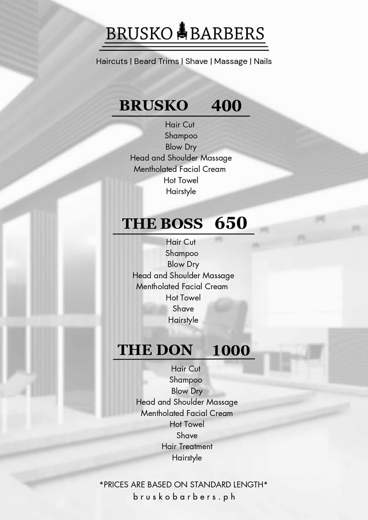 BRUSKO BARBER IS COMMITTED IN GIVING THE BEST GROOMING SERVICES TO MEN. AIM TO PROVIDE WOWING SERVICE TO EVERY GUEST. PROMOTES DIVERSITY AMONG MEN PREFERRED INDIVIDUAL ELEGANT LOOK AND STYLE VALUE FOR MONEY WELL TRAINED "BARBEROS"